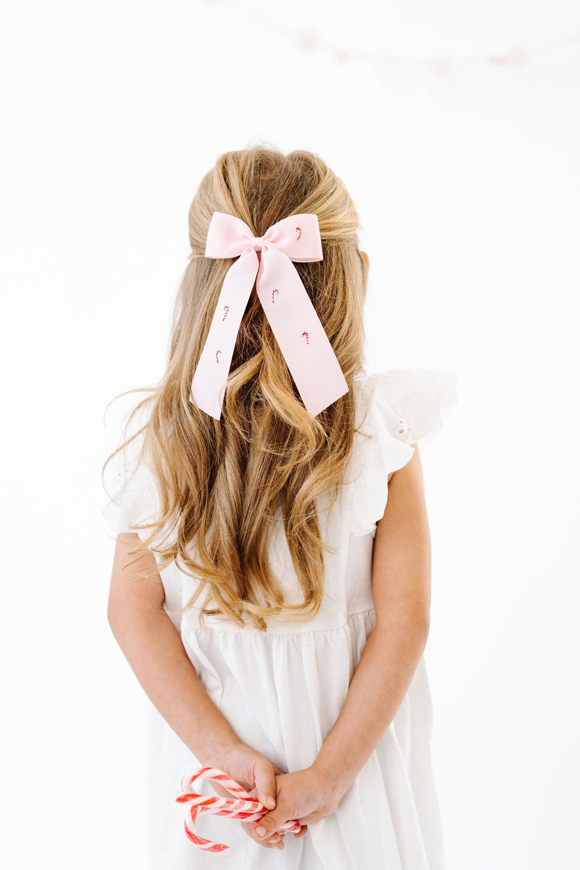 Hand-embroidered candy canes on a pink ribbon! We love this with our Ginger collection!
