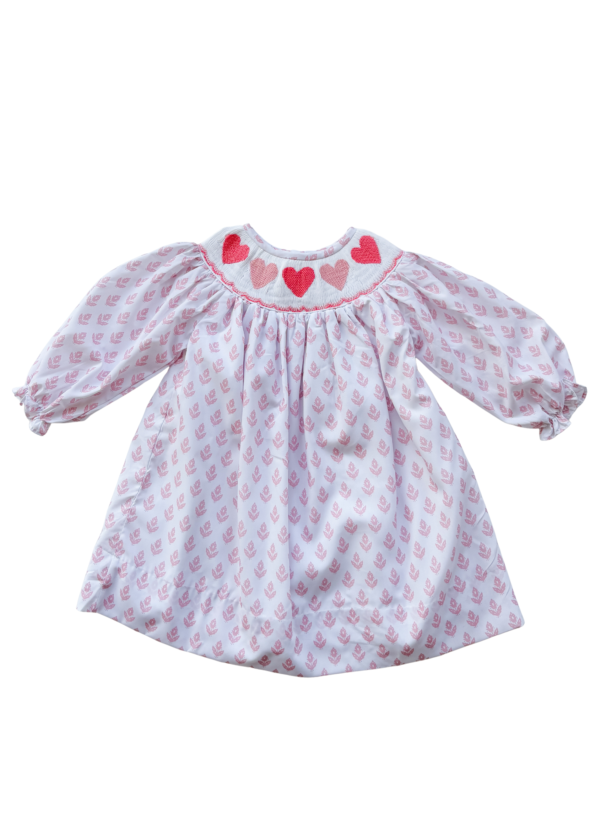 This dress is inspired by one of our favorite Valentine's books, Adeline, and one of our favorite trends, block print!! Featuring alternating pink hearts, your little girl will look absolutely precious in this design! Pair with The Adeline Bubble for a sister match!