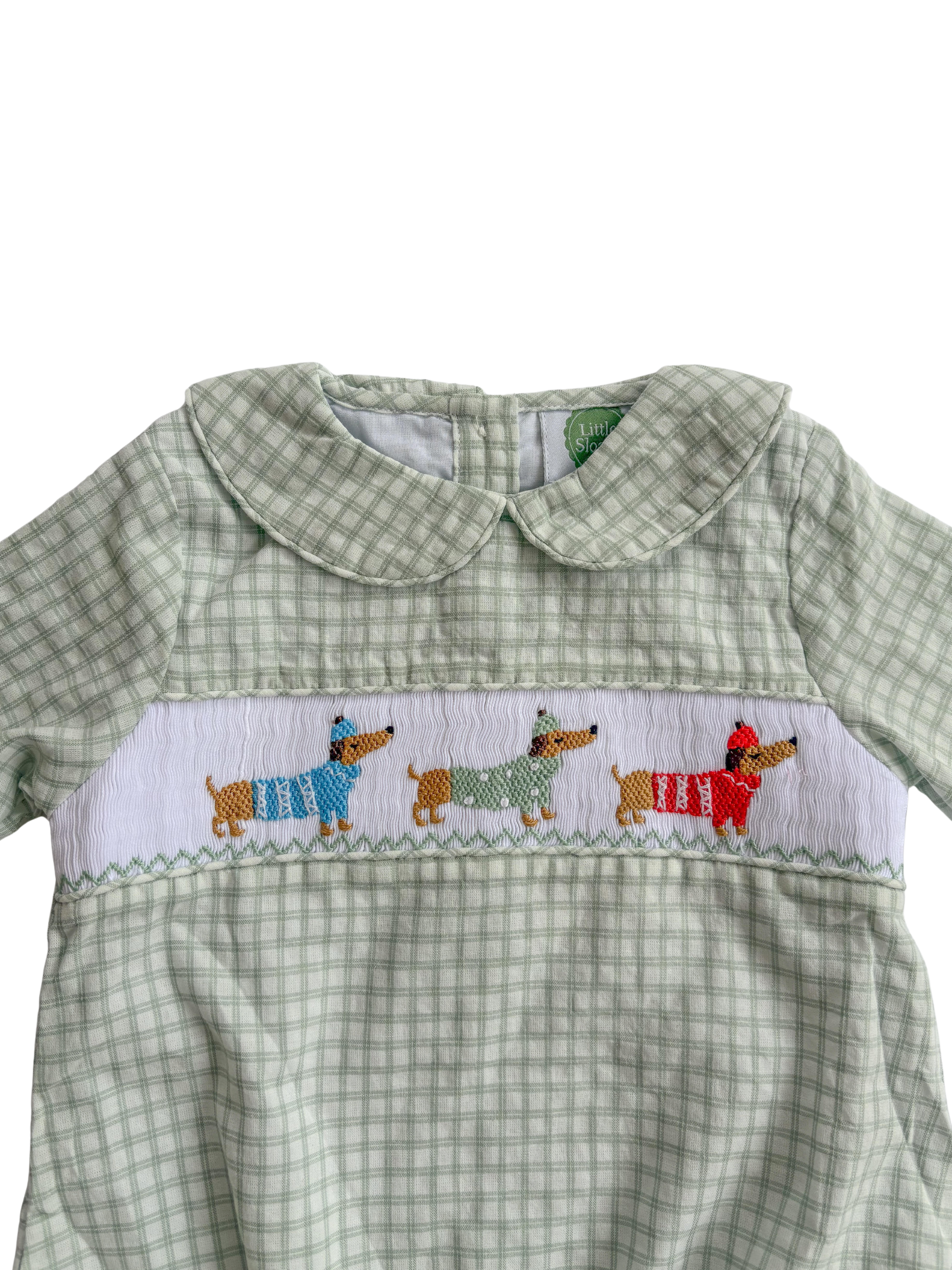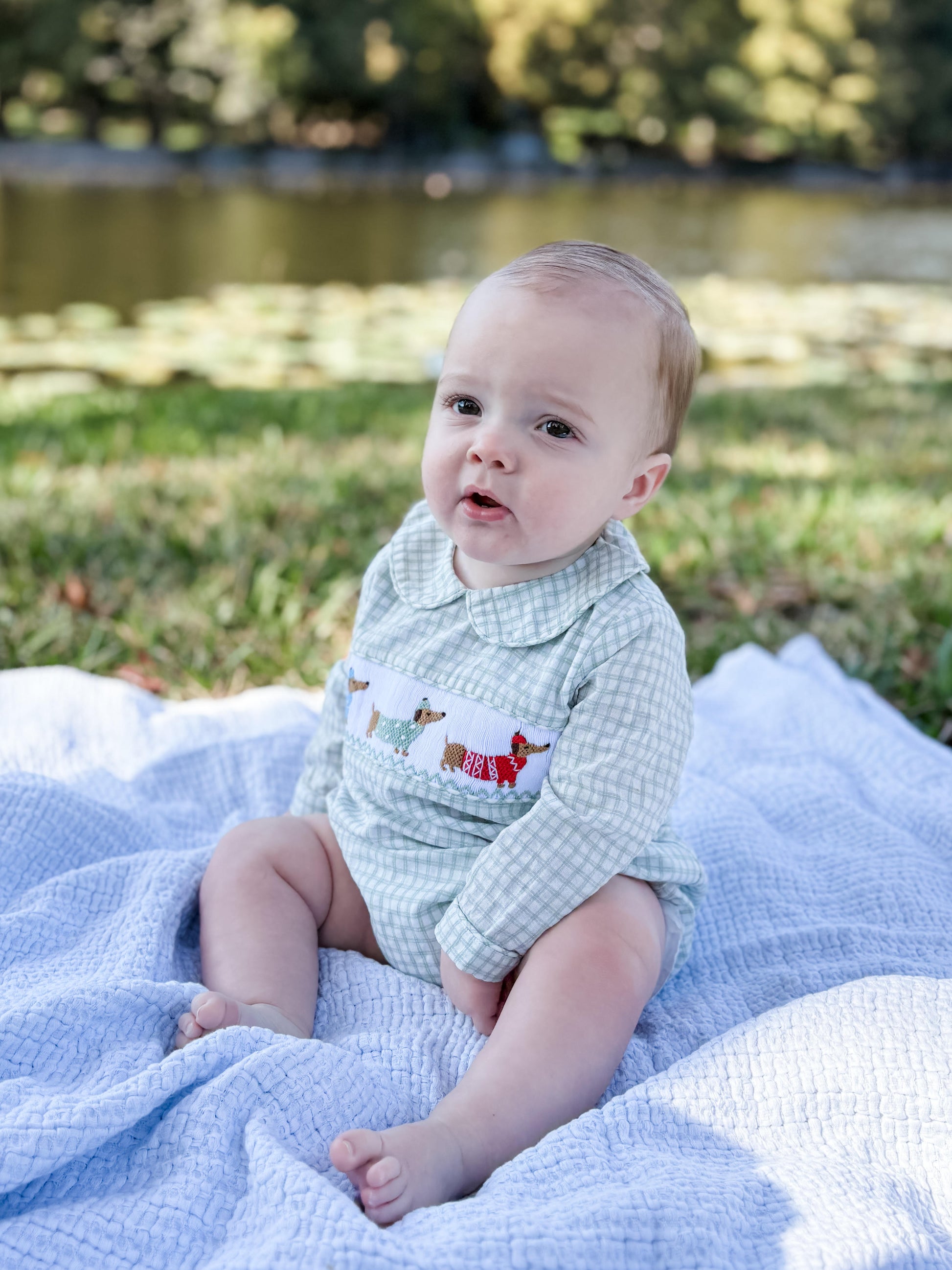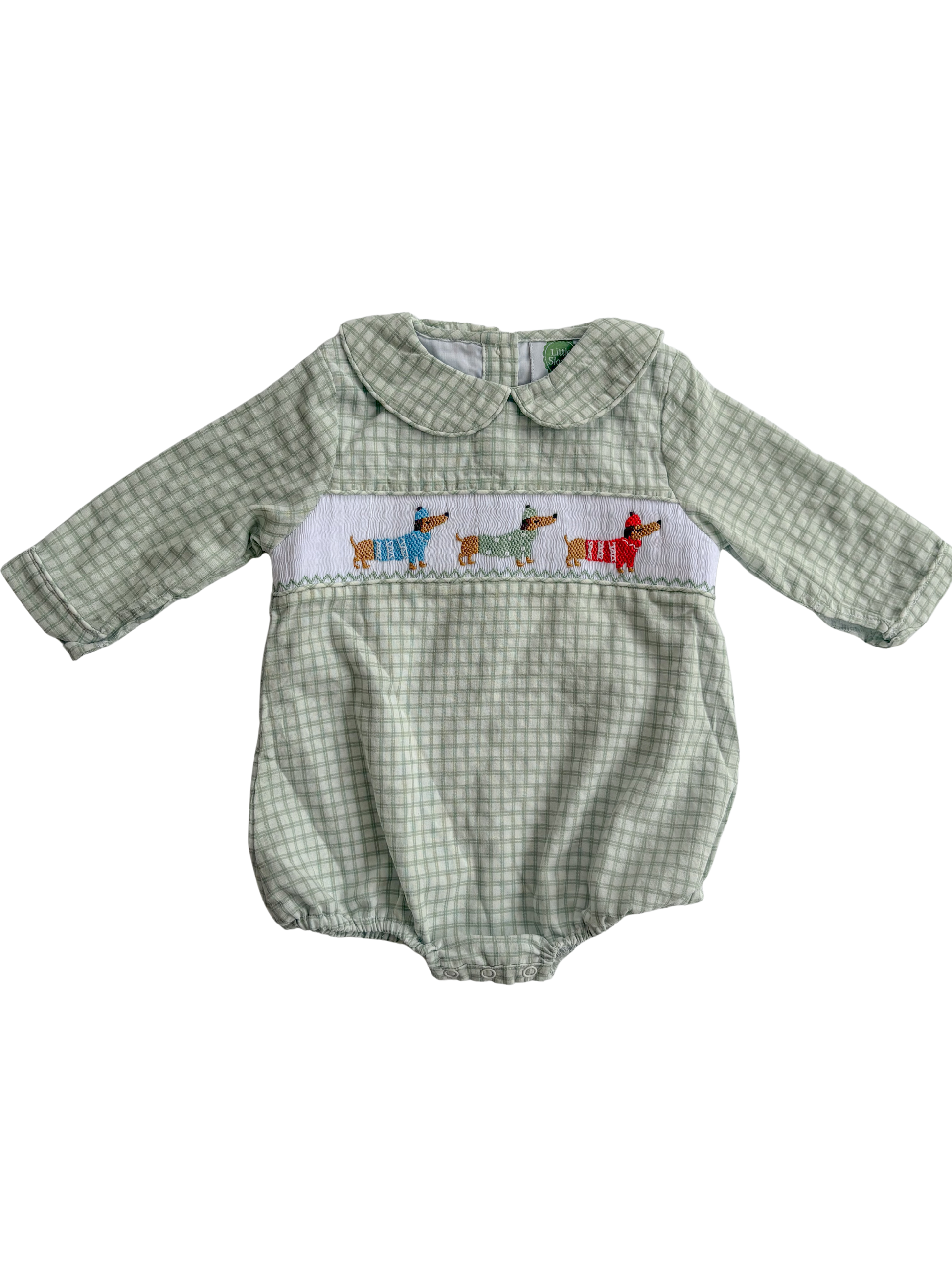 How fun are these winter wieners?? We love these cozy dachshunds, and we know you will too! The Pretzel and The Greta were inspired by the book "Pretzel" by Margret Rey - a precious story if you haven't already read it!! We love the matching longall and t-shirt set for brothers and the bubble and dress for sisters as well!